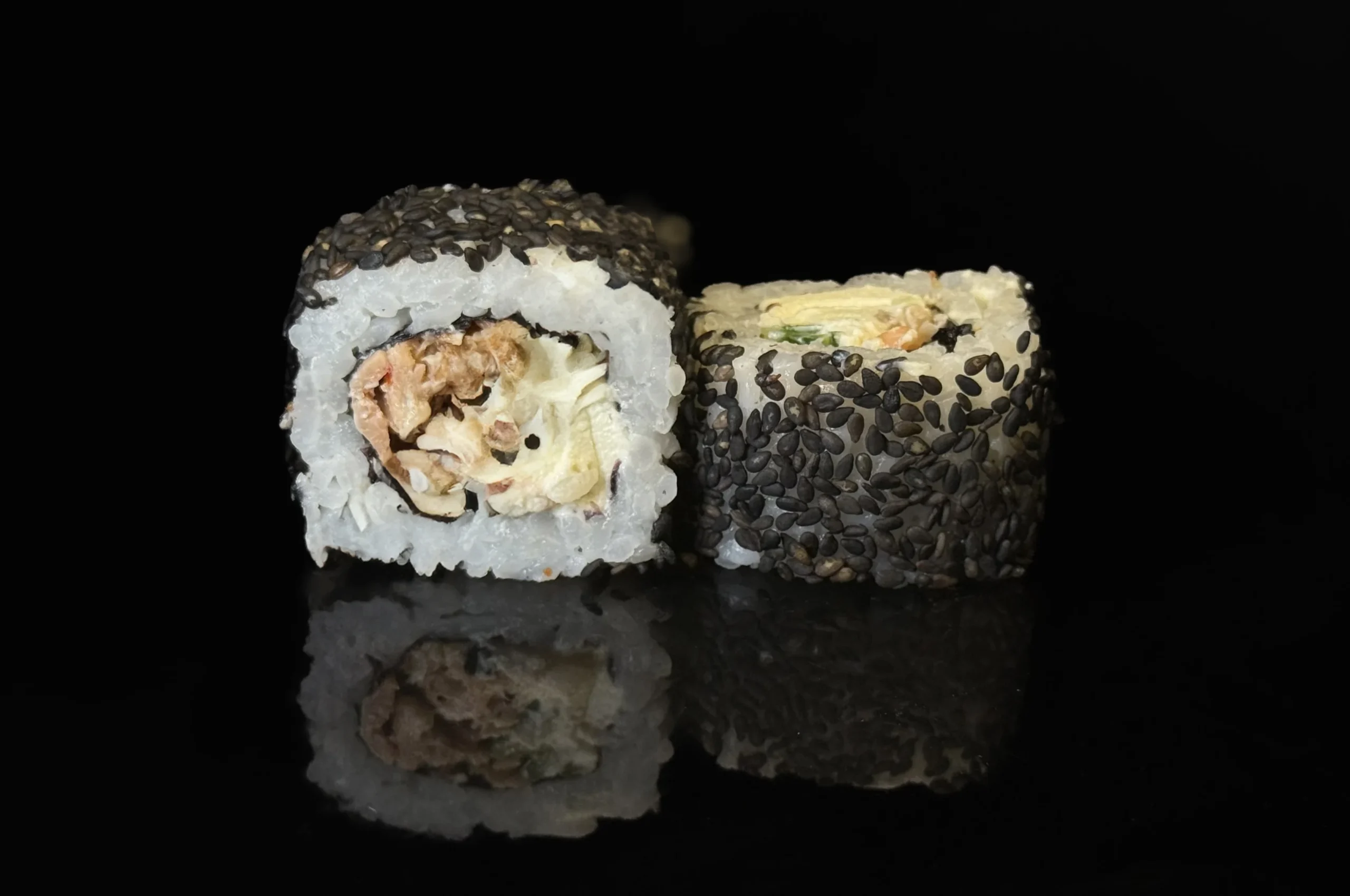 mit Surimi, Frischkäse, Tobiko, Gurke, Nori, Reis, schwarzem Sesam